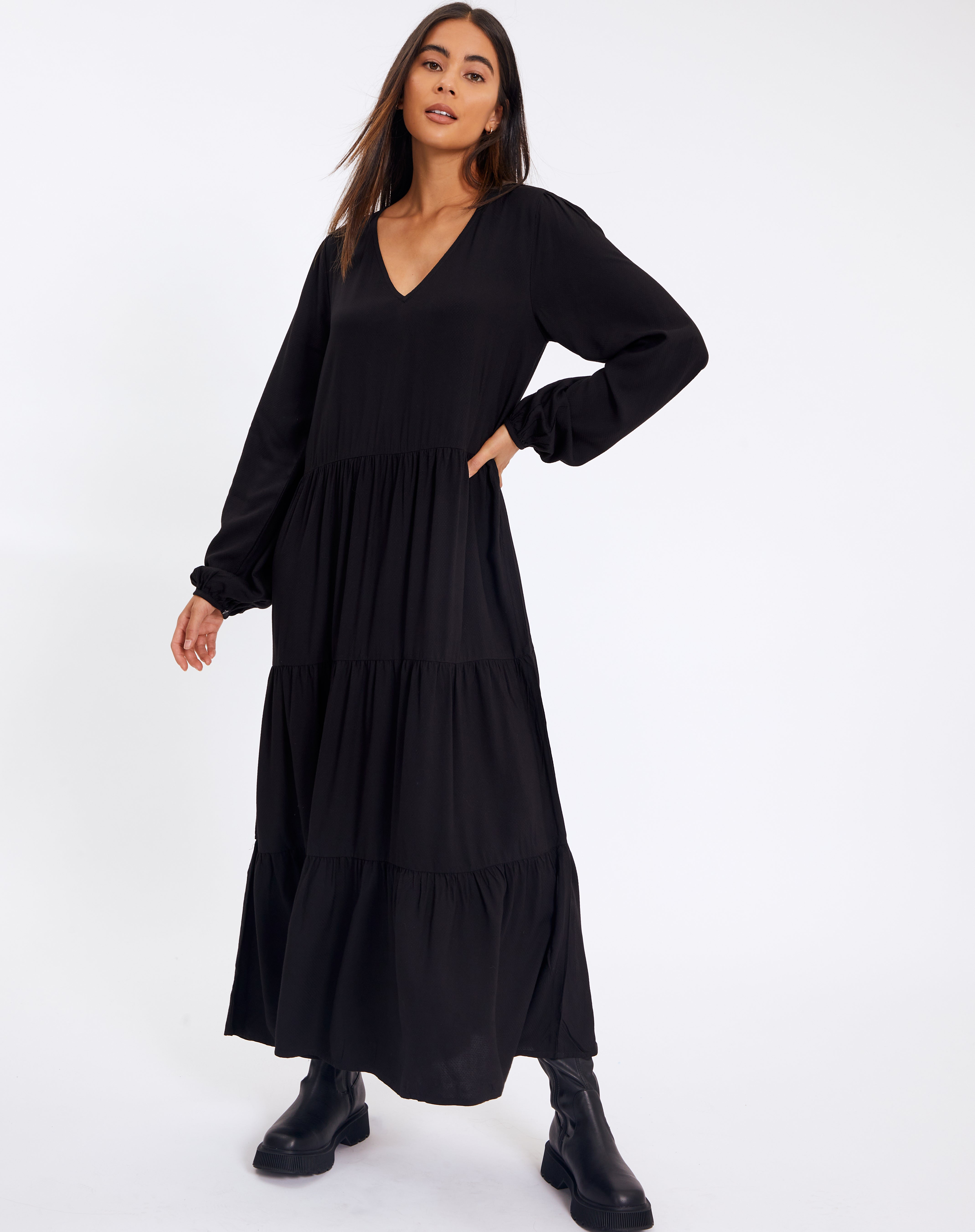 V Neck Puff Long Sleeve Tiered Maxi Dress In Black Glassons